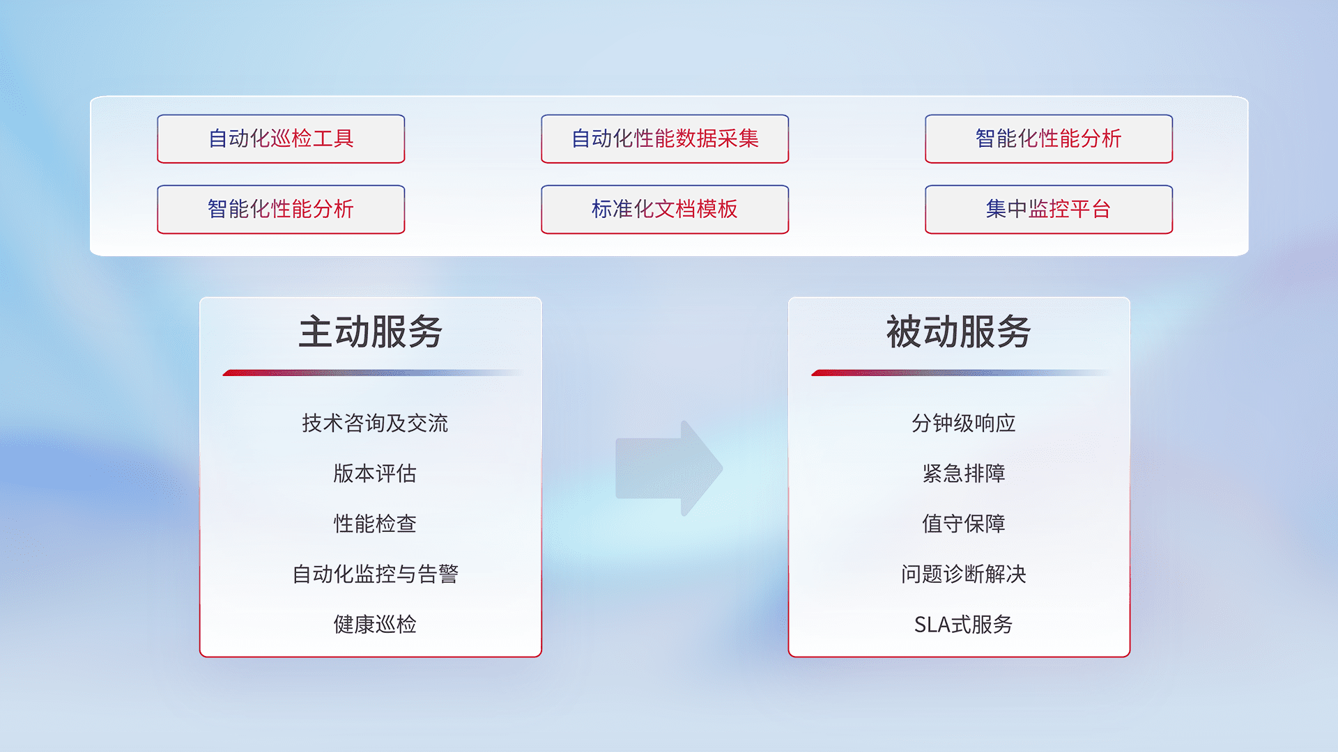 智能化工具和标准化文档,,,,保障服务质量,,,,提供主动服务(包含技术咨询、、、版本评估、、性能检查、、、自动化监控与告警、、、健康巡检)和被动服务包含(分钟级响应、、、紧急排障、、值守保障、、问题诊断解决、、、SLA服务)。。